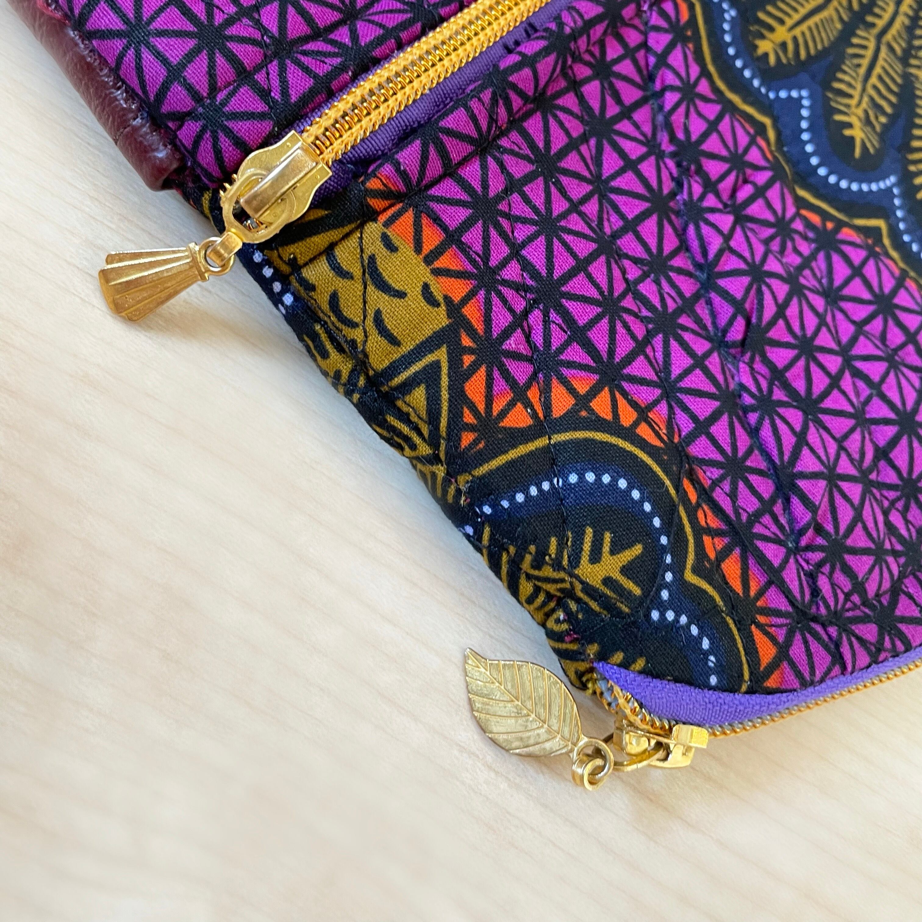 鮮やかなアフリカ布とレザーの組み合わせが、モダンで目を惹きます。